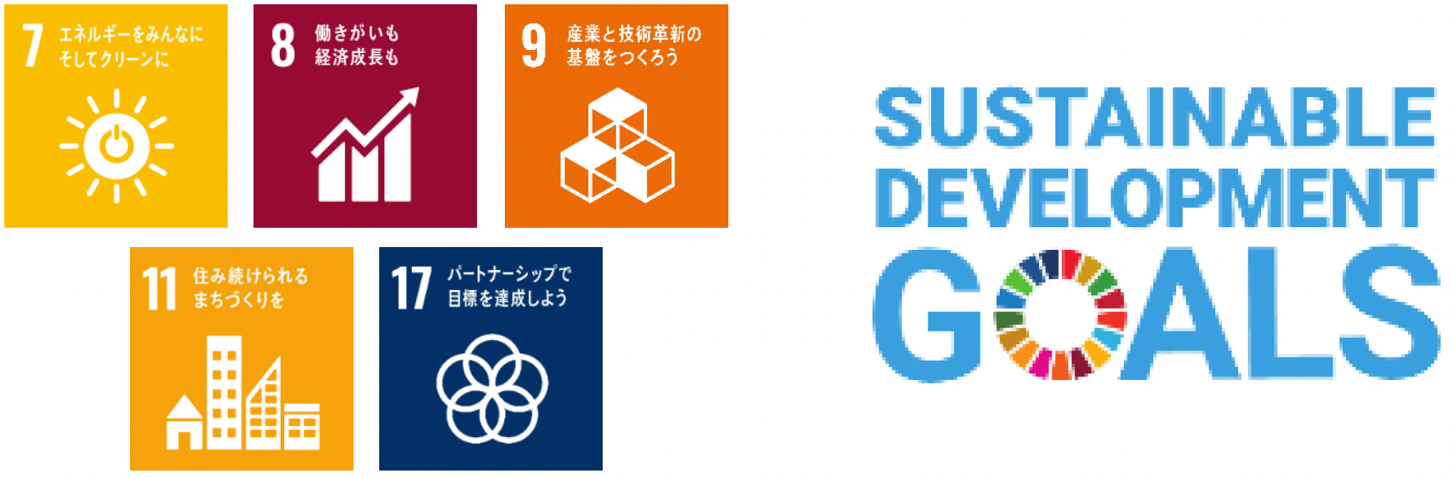 目標7 エネルギーをみんなにそしてクリーンに 目標8 働きがいも経済成長も 目標9 産業と技術革新の基盤をつくろう 目標11 住み続けられるまちづくりを 目標17 パートナーシップで目標を達成しよう |