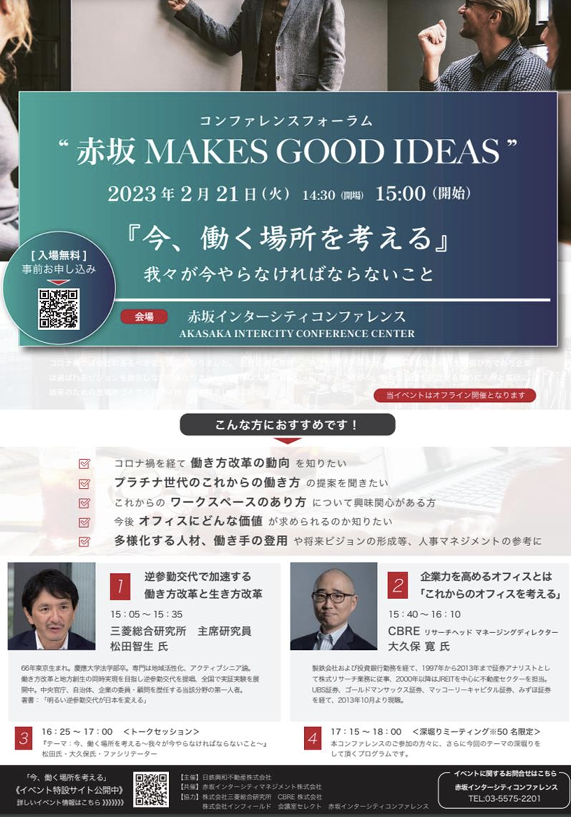 日鉄興和不動産株式会社(本社:東京都港区、代表取締役社長:今泉 泰彦)は「赤坂インターシティコンファレンス」におきまして、下記の通り、赤坂インターシティマネジメント株式会社(本社:東京都港区、代表取締役社長:塚田 佳志)との共催でコンファレンスフォーラム "赤坂 MAKES GOOD IDEAS" 『今、働く場所を考える』 を開催いたします。
