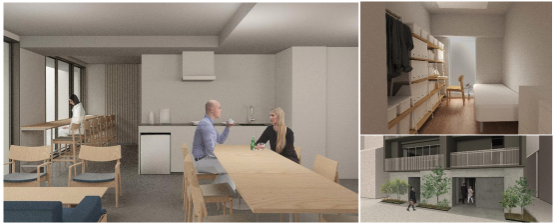 本物件は、入居者が住まいの中で「自分の居場所」を複数持てることで居⼼地の良さを感じられるという、暮らしの選択肢を広げる仕組みを持たせました。2階のカフェを地域住民にも利用可能とすることで、入居者と地域住民のゆるやかな繋がりも生みだす「居場所が混ざり合う暮らし」を提案します。