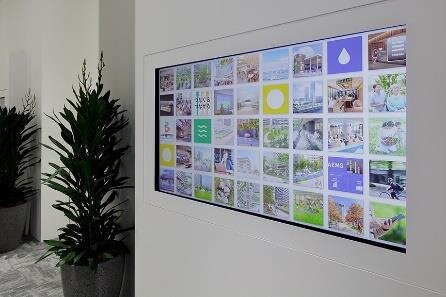 凸版印刷株式会社の システムを導入し、「HARUMI FLAG」の様々な魅力を 、タッチパネルの簡単操作で学べるデジタルサイネージです。街の施設、共用 スペース の特徴や各棟を紹介するCG映像などのほかに、各エリアを担当した25名ものデザイナーのプロフィールや 、デザイン コンセプトなどもご覧いただけます。