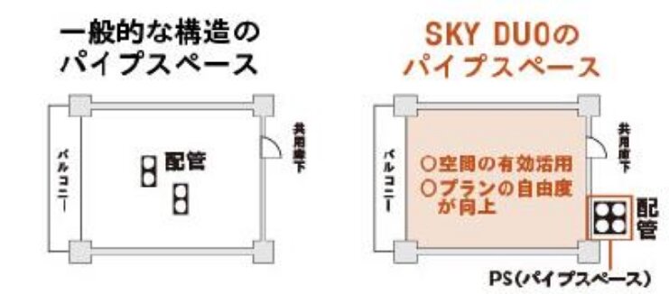 構造躯体を表す「スケルトン」と内装・設備を表す「インフィル」を分離することで、一般的に住戸内に配置され専有面積に含まれるパイプスペースを、住戸外に設置することが可能になります。これによって、居住空間の有効面積を高め、より効率的でゆとりある空間設計を可能にします。また、水廻りも含めた間取りの可変性も高めるため、将来のライフスタイルの変化にも応えることができます。
