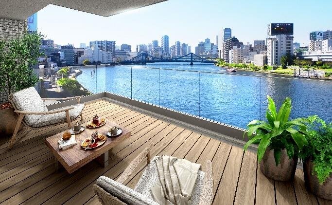 また、隅田川を一望できるリバーフロント立地を生かし、専有部では、西側住戸(※1階を除く)に奥行約2.6mのバルコニーを設け、室内とのつながりを意識した人工木デッキから開放的な隅田川ビューを望める計画としました。立地希少性の高さから、4 月公式ホームページ公開より約 4 か月で資料請求数 2,078 件を獲得、サイト公開直後から不動産ポータルサイトへアクセスが集中し、「アットホーム」、「LIFULL HOME'S」、「Yahoo!不動産」の城東エリア、江東区エリア内での本物件へのアクセス数・資料請求数がNo.1となりました。※1 (2023年8月7日時点)