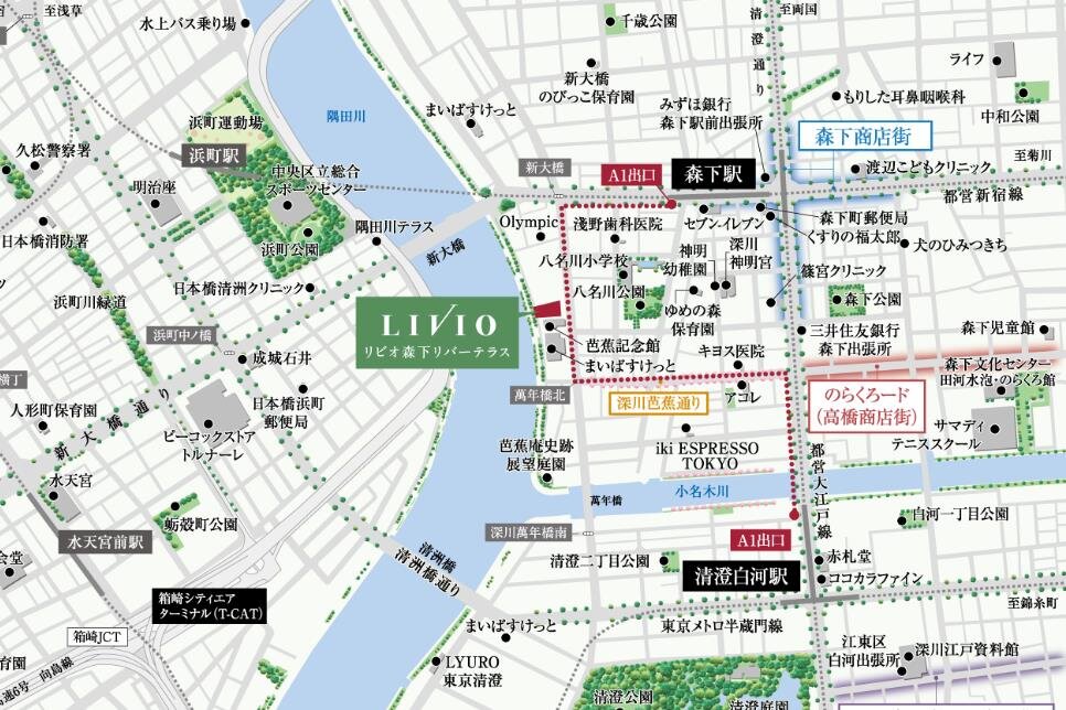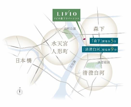 『リビオ森下リバーテラス』は、松尾芭蕉、葛飾北斎などあまたの文人墨客が往来し、いまなおその風情を残す「森下」と、下町情緒とアートスポットやカフェなど洗練が交差する「清澄白河」、そして隅田川を渡ると「日本橋」と、誰もが暮らしやすいエリアを居住環境とします。