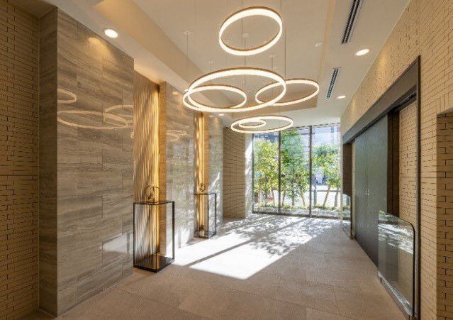 『リビオレゾン八王子レジデンス』のコンセプト「絹を纏う。」は、絹織物の生産で栄えた八王子の歴史にインスピレーションを得て生まれました。外観には生糸の光沢を感じさせるタイルを使用し、艶と光沢のある外観に仕上げ、エントランスには木調天井を取り入れました。天井高 3.7mのエントランスホールは開放感があり、住まう人を優しく出迎える空間です。共用廊下はセキュリティ性の高い内廊下を採用しています。天候による影響も受けず、常に快適で美しい空間が保たれ、上質感のある雰囲気を演出しています。