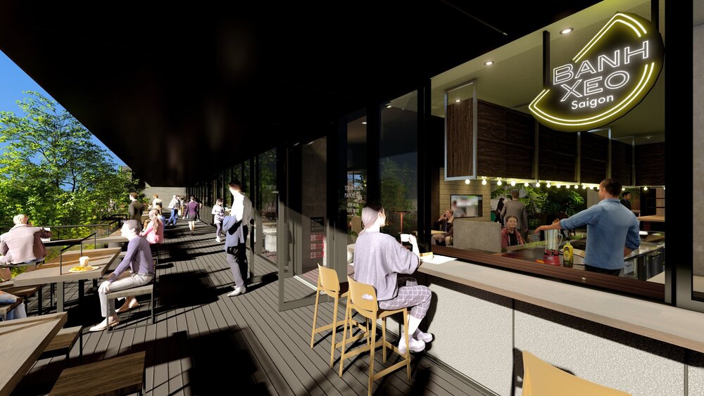 一方で、一部の店舗にはオープンキッチンや外のテラスに面したテイクアウトカウンターを設置し、フードホールならではのライブ感もお楽しみいただけます。夕方からは照度を落とし音楽に包まれながらくつろげるラウンジとして、イベント開催時には新たな交流の場として。一人一人の多様な過ごし方を後押しする空間デザインです。