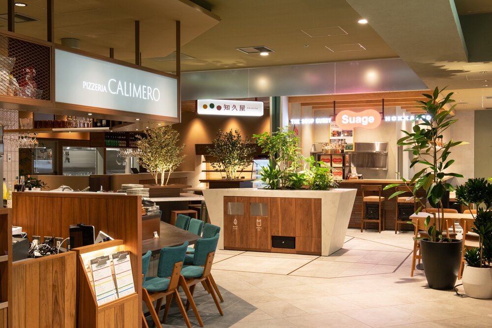 さらに、各店舗のサインデザインはあえて統一せず規制を設けすぎないことで、全体として「整えすぎない」絶妙なバランス感を実現し、活気のある空間に仕上げています。また、時間帯で変化するライティング演出もポイントです。昼間は外光に合わせた昼白色とし、夕方にかけて色温度を落とすことで落ち着いた雰囲気を醸成。夜間は電球色で低めの照度とし、植栽をアッパーライトで照らして天井に葉影を映し出すことで雰囲気を演出します。