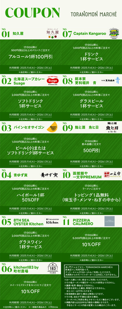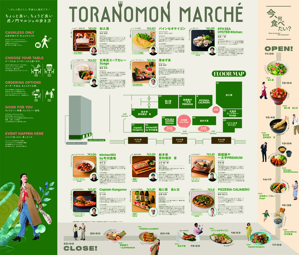 また、訪れるお客さまや地域住民・ワーカーの方に、虎ノ門・赤坂エリアの街の魅力も一緒にお楽しみいただけるよう、赤坂・虎ノ門緑道を中心としたエリアマップ、各店舗・スタッフ紹介、産地の取材記事など、食と人とのつながりを多角的に発信するフロアガイドを発行します。併せて各店舗の個性を反映したお得なクーポンも配布します。