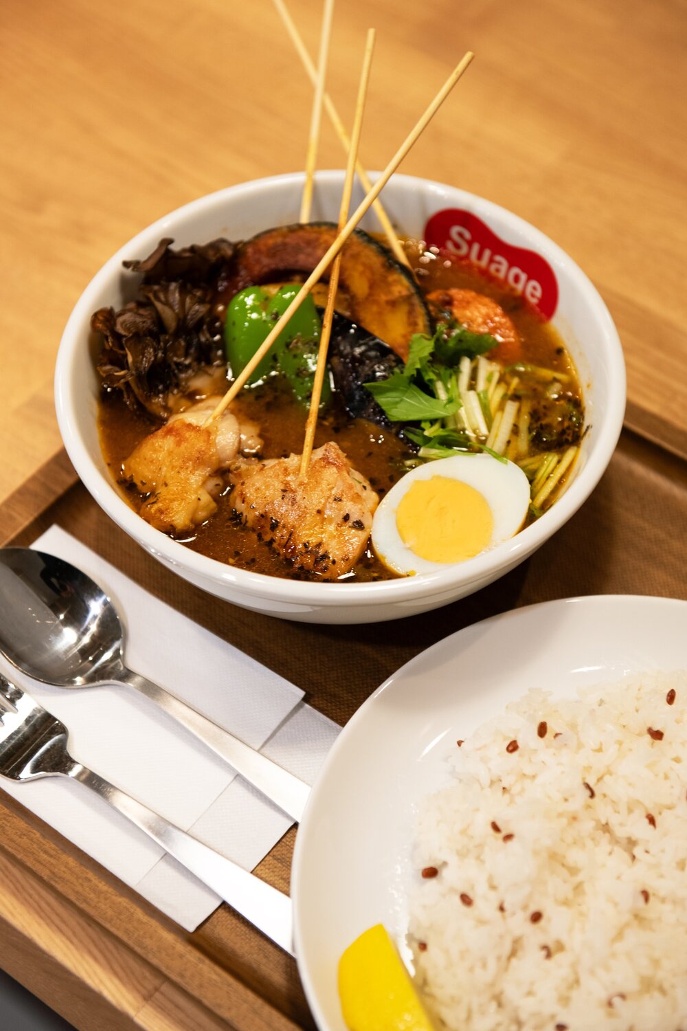 北海道札幌スープカレーの名店。北海道野菜を中心とした具材は、店名の通り"素揚げ"をし、素材ひとつひとつの旨味を引き出しています。スープは飴色たまねぎやトマトの奥深い旨味とスパイスを効かせ、さらにご飯にはレモンを添えて。味の変化に富んだ、とっておきの一皿をお届けします。