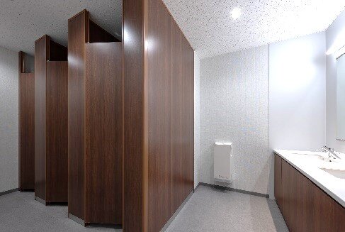 車両と歩行者および自転車の出入口を分離し、安全性に配慮した動線計画としました。1階に片面バースを備えた地上4階建てBOX型の施設とし、2分割でも利用可能な汎用性のある平面計画としています。外観は、断熱性・耐震性・美観に優れた金属断熱サンドイッチパネルを採用しています。シルバーとダークグレーのモノトーン調を基調として横ラインのアクセントを採り入れ、周辺への圧迫感軽減に配慮したデザインとなっています。エントランスホール、トイレ等の内観は、間接照明と木調で温かみのあるデザインとし、落ち着いた温もりのある上質な空間を演出しています。