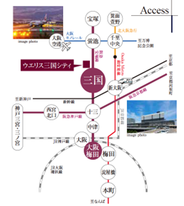 徒歩7分の阪急宝塚線「三国」駅から、大阪梅田へ直通3駅7分。神戸や京都方面へのアプローチも便利なポジションです。また、伊丹空港や新大阪へのアクセスも快適で、急な出張にも便利です。さらに、現在建設中で、2031年開通予定※の「なにわ筋線」は、JR西日本と南海電鉄が直通運転を行 い、JR「大阪」駅地下ホームと、JR「難波」駅、南海「新今宮」駅をつなぐ鉄道路線です。さらに、まだ構想段階ですが、なにわ筋線の「大阪」駅と阪急「十三」駅とを連絡する路線として、「阪急なにわ筋連絡線」も検討されており、実現すれば阪急沿線から大阪ミナミや関西国際 空港へのアクセス性が飛躍的に高まります。