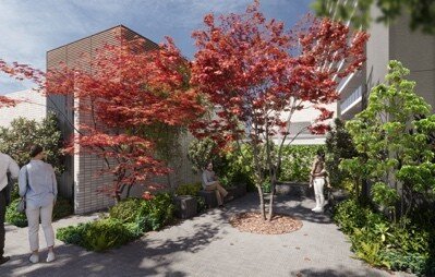 居住者同士が集い、会話ができる場として、かまどスツールを設置した広場を計画。木々に囲まれた空間で、交流を深める場とします。