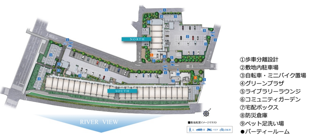 リバーフロントに面するサウスでは、3階以上の住戸からリバービューを楽しめる計画とし、サウスから対岸まで約150mの離隔距離を確保。都心方向への眺望の広がりに加え、豊かな開放感と陽光を住まいに取り込むことにより、のびやかな暮らしを提案します。