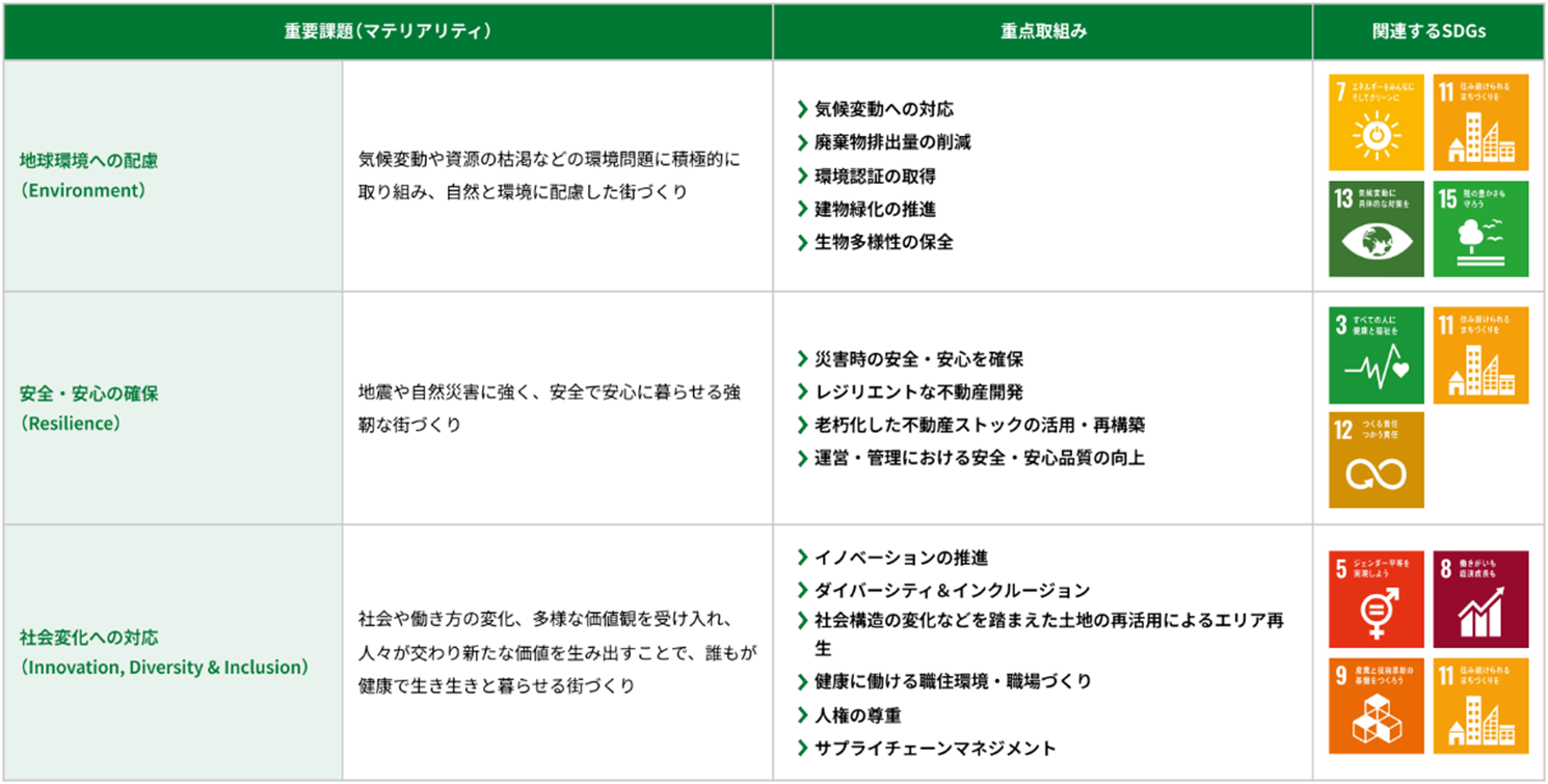 日鉄興和不動産は、総合デベロッパーとして、持続可能な社会・都市を実現していくことが使命であると考え、「地球環境への配慮」「安全・安心の確保」「社会変化への対応」を、全社横断的に取り組む重要課題(マテリアリティ)として定めています。