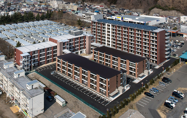 Supporting Rapid Recovery Efforts and New Community Development in Kamaishi City: A total of 210 public housing units were developed for post-disaster reconstruction on land owned by Nippon Steel. To provide housing to disaster victims as quickly as possible following the earthquake, the project was developed within a short timeframe and at low cost. The project also fosters community-building by providing spaces for interactions between residents and incorporating community-based support for elderly residents and those living alone.