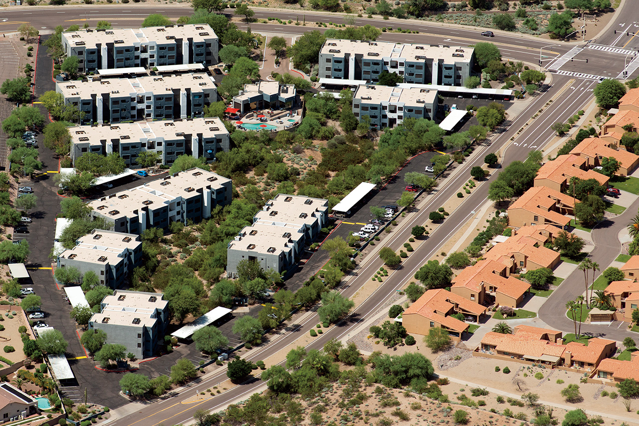 Metro Phoenix is a growing area that is attracting major semiconductor-related companies and other industries. This apartment complex, while located in a tranquil residential area on a hill overlooking the mountains, offers easy access to the flourishing office district in the city center. Amenities include a gym and outdoor pool, and the precinct includes a nature reserve.