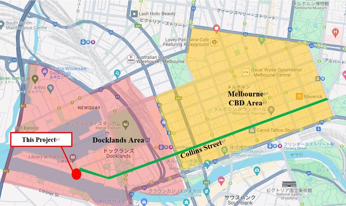 The plan for this Project is to develop a 24-story rental residential building with a total of 499 units in the Docklands suburb, located approximately one kilometer west of Melbourne’s CBD (Central Business District). The surrounding area is home to a concentration of residential complexes and amenities for daily life, including large commercial facilities, as well as the ANZ Bank headquarters and Monash University, with strong demand for housing that allows residents to live close to their workplaces. Furthermore, the property is a one-minute walk from the Bourke St/Collins St stop on the city’s tramway network, offering excellent access to Melbourne’s CBD. With numerous developments underway in the surrounding area, including Lendlease’s Melbourne Quarter project and multiple residential developments, convenience is expected to be further enhanced going forward.