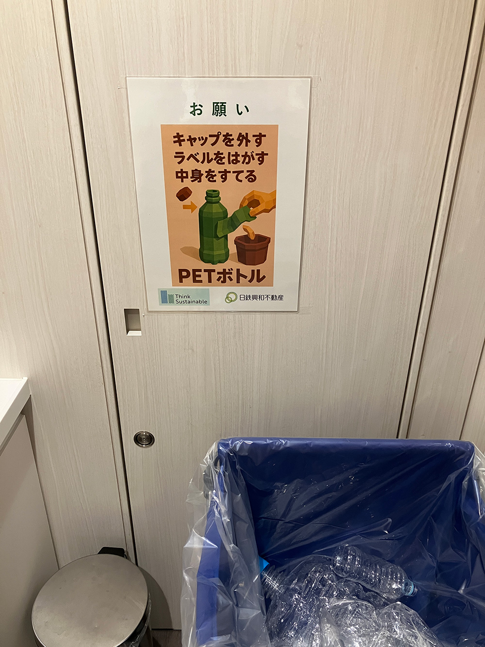 本社では、資源リサイクルの一環として「ペットボトルのラベル剥がし運動」を実施しています。この取組みは、ペットボトルをより効率的にリサイクルするために、社員一人ひとりがラベルを剥がしてから分別廃棄することを習慣化するものです。社内の給湯室や共用スペースには、ラベル剥がしを促すポスターを掲示し、分別ボックスも設置しています。
